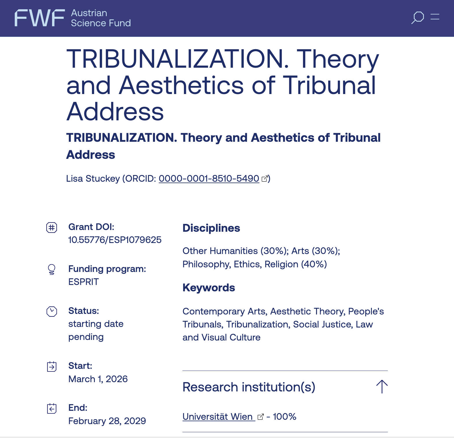 PR-Abstract: Tribunalization is a multifaceted and ambiguous notion. While tribunals are predominantly recognized as legal and quasi-legal entities, dynamics of tribunalization can be observed across various societal domains, media landscapes, cultural spheres, and current arts. Situated at the crossroads of art studies, media aesthetics, political theory, and critical legal studies, this project investigates tribunalization as a transversal phenomenon through cultural analysis, with a focus on contemporary arts and activism. Drawing on exemplary tribunals from the past decade, the study analyzes a range of tribunal formats, including postdramatic theater hearings, postconceptual art installations, hybrid assemblies, and activist coalitions. These tribunals delve into a range of timely and contentious issues, such as the climate crisis, the erosion of democratic institutions, and the freedom of the arts. The objectives of this project are threefold: to outline a theory of tribunalization, to advance the research field of tribunal aesthetics, and to conceptualize the figuration of tribunal address. Through this framework, the project aims to critically reflect on ethical and aesthetic dimensions of tribunalization, highlighting its complexities and ambivalences in confronting disturbing realities.